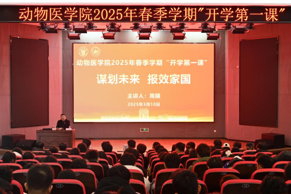周顺院长结合2024级学生普遍特点与新时代行业变革趋势,对青年学子提出四点要求:一是立长志,法乎其上。“若只满足‘会打疫苗’便是法乎其中,立志成为专科兽医、行业领军者方能‘得其上’。”要求学子以国际视野设定目标,要深刻把握时代脉搏,将个人理想融入国家发展大局,在科技创新主战场勇担使命。二是重行动,知行合一。强调“强体魄是另一种孝顺”,呼吁学生通过体育锻炼提升身体素质,积极投身于多样化的体育运动之中精神面貌也会焕然一新,以更饱满的精力投入学习,让父母不再为自己的健康与学业忧心,真正用行动诠释“强体魄”背后蕴含的孝顺深意,在实践实训中提升解决复杂问题的能力。三是善借力,内外兼修。善用校企合作、行业展会等资源拓展视野,同时锤炼共情能力,要厚植家国情怀,践行社会主义核心价值观,在服务社会中彰显责任担当,他指出“兽医的听诊器需同时倾听动物心跳与时代脉搏”。四、担使命,服务家国。将职业价值升华为社会贡献,从“治愈一只宠物守护家庭温暖”的仁心善举,到“突破一项技术助力行业破局”的工匠精神,要始终将个人职业价值融入国家发展大局,在科技创新主战场、民生服务最前沿展现青春作为。