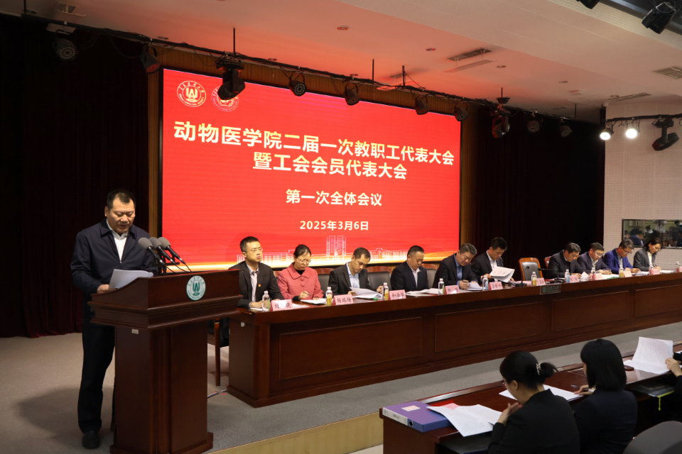 在庄严的国歌声中,大会正式拉开序幕。院长周顺作题为《以申博和学科评估为抓手,建设特色鲜明的应用研究型学院》的工作报告,系统总结2024年发展成效,擘画2025年攻坚蓝图。报告指出,过去一年,学院锚定高质量发展目标,以党建为引领深化立德树人,着力推动内涵式发展,在“双融双创”、科技自立、学科建设、人才战略等多方取得显著成效。同时,直面学科发展无“山”无“峰”等短板,强调需以刀刃向内之决心深化改革。周顺指出,展望2025年,学院以习近平新时代中国特色社会主义思想为指导,全面贯彻落实党的二十大和二十届二中、三中全会精神,深入学习贯彻学校第三次党代会精神,聚焦“十四五”收官与“十五五”谋篇,以“冲刺兽医学博士点授权和第六轮学科评估”核心目标为抓手,着力实施党建铸魂,凝聚奋进力量;深化师资队伍建设,构筑学科人才高峰;树牢学科龙头地位,着力提升学科建设水平;聚焦学生成长与发展,构建人才培养新格局;深入推动有组织科研,夯实科研创新根基;深化高水平国际合作,提升国际化办学水平;深化内部管理,提升管理服务效能等七大攻坚行动,聚力打造服务乡村振兴战略的高水平应用研究型学院,奋力书写新时代学科建设与人才培养的“攀登答卷”。