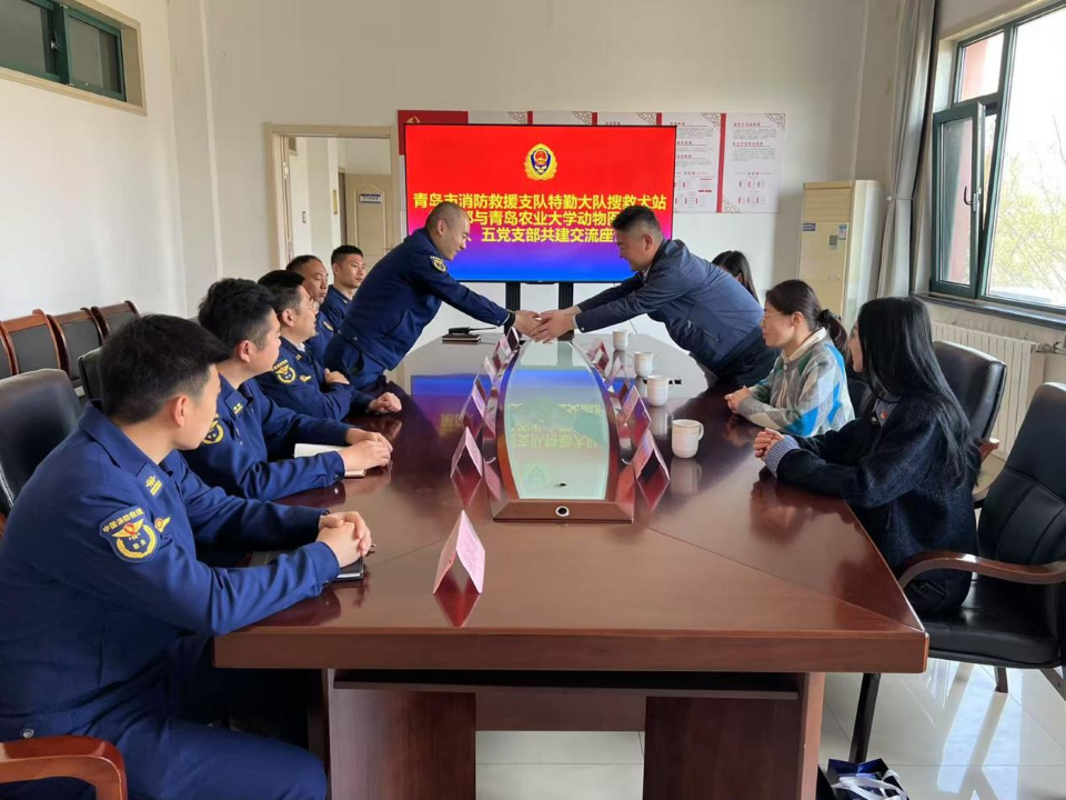 4月9日上午,欧洲杯买足球软件第四、五党支部与青岛市消防救援支队特勤大队搜救犬站党支部在青岛市消防救援支队特勤大队搜救犬站,以“党建引领聚合力 医疗保障提质量 携手共建护平安”为主题联合开展共建交流活动。双方以党建为纽带,推动党建与业务深度融合,共促搜救犬医疗技术与实战能力提升,为应急救援事业筑牢安全防线。